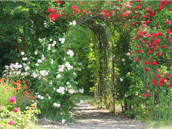 garden with ateliers and walkways and arches covered in climbing roses