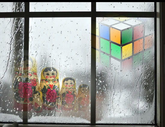 alternatively at the rivulets of water running down the window and the