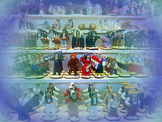 the hand carved wooden models of shopkeepers and tradesmen in the scene.