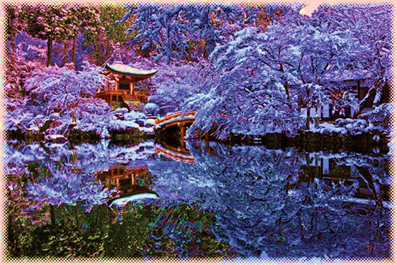 She looked again at the image of a dozen or more small red lacquered wooden buildings rising up a steep hill, the paths between them nearly lost amongst a forest of small trees. When the photograph was taken the whole scene was covered in a layer of snow adding to the beauty.