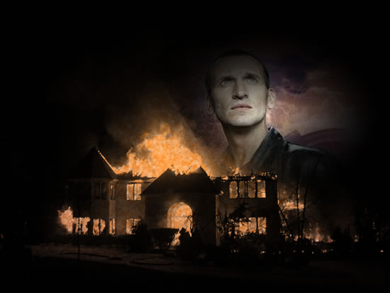 they saw the house engulfed in flames. The Doctor closed off the screen,