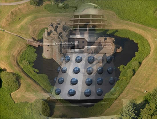 “Caerlaverock Castle,” he said. “Or the ruins of it. The Daleks landed their mothership on top of it and dug in. Three months ago, two men risked their lives getting in there.” He glanced at the Harris brothers as he said that, but didn’t elaborate further. “They found out that the Daleks had sunk shafts right down from their ship into the old dungeons and fixed gravity lifts in them. They are using the dungeons as their central command. The ship, above ground, has automatic laser guns that would kill anyone trying to approach from the air, even if we had a helicopter. The moat around the castle is deep, and there are robomen posted on the battlements day and night. Between the ancient fortress and their new technology it’s practically impregnable. Or it was. With your TARDIS we could get right in there, take the fight to them.”